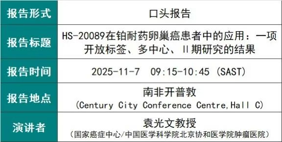 本次大会的研究结果显示,截至数据截止日期(2025年6月20日), HS-20089在未筛选B7-H4表达的情况下,在经多线治疗失败的铂耐药卵巢癌(PROC)患者中展现出令人鼓舞的疗效。在所有接受过HS-20089 4.8mg/kg治疗的PROC患者中,中位随访时间为11.5个月,确认的客观缓解率(ORR)为48.5%,缓解持续时间(DoR)达6.8个月;中位无进展生存期(mPFS)为6.4个月,中位总生存期(mOS)为14.6个月。HS-20089注射液的安全性特征与I期研究结果一致,未观察到间质性肺病的信号。上述临床研究结果支持该药物在PROC患者中的进一步开发,目前相关的Ⅲ期研究(NCT06855069)正在进行中。