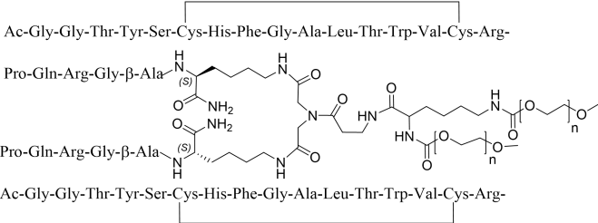 化学名称:N ε,22 ,Nε,22’-({N α ,N ε-二[ω-甲氧基聚(氧乙烯基)羰基]赖氨酰-β-丙氨酰基}亚胺基 二乙酰基)-二(乙酰基甘氨酰-甘氨酰-苏氨酰-酪氨酰-丝氨酰-半胱氨酰-组氨酰-苯丙氨酰-甘 氨酰-丙氨酰-亮氨酰-苏氨酰-色氨酰-缬氨酰-半胱氨酰-精氨酰-脯氨酰-谷氨酰胺酰-精氨酰- 甘氨酰-β-丙氨酰-赖氨酰胺)环(6-15:6’-15’)-双二硫化物